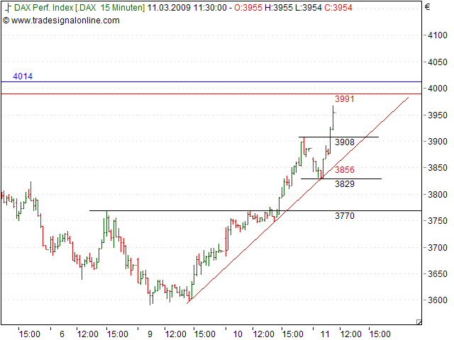 Die Verteidigung der Parallelen (akt. bei 3.608 Punkten) zu dem im Januar ausgeprägten Abwärtstrend erwies sich für den DAX® gestern als Sprungbrett für einen dynamischen Aufwärtsimpuls. Im Rahmen dieser Bewegung gelang dem Aktienbarometer im Tagesverlauf auch der Sprung über den seit Anfang Februar dominierenden Abwärtstrend (akt. bei 3.724 Punkten), so dass die Basis für eine Fortsetzung des Aufwärtsimpulses gebildet ist. Die nächste Anlaufmarke wartet nun in Form des Hochs vom 4. März bei 3.892 Punkten. Fällt auch diese Hürde, kann sogar ein Wiedersehen mit dem massiven, aus mehreren Tiefpunkten resultierenden Bollwerk eingerechnet werden, das sich von 4.015 bis 4.067 Punkten erstreckt. Ein Test dieser Hürden – mehr trauen wir auf aktueller Basis dem DAX® nicht zu – würde einen klassischen Pullback an das ehemalige Ausbruchniveau darstellen. Insbesondere die klaren Kaufsignale bei MACD und Aroon sprechen dafür, dass sich der Aufwärtsimpuls des DAX® noch ein wenig fortsetzt.