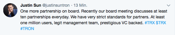 TRON has partnered with public listed companies and large user based companies such as Baofeng, Gifto, Obike, Peiwo and game.com. Our partners will develop their dapps on TRON platform once everything is ready. With 40 million users on board, TRON ecosystem is very robust. It is just a beginning. We have 10 more prestigious partnerships in the pipeline and keep growing everyday. It is just a matter of time that we will have 100 million users.