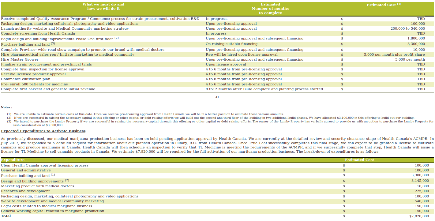 In den letzten 3 Monaten wurden 14 Lizen vergeben, in den 45 Monaten davor insgesamt 42. Momentan hat sich die Geschwindigkeit bei der Vergabe etwa verfünffacht und True Leaf gehört zu den frühen Antragstellern. Die von Health Canada neu angeforderten Unterlagen wurden bereits vor einiger Zeit mit Hilfe von Profis auf diesem Gebiet eingereicht. Man darf also optimistisch sein, auch was den Zeitfaktor betrifft.
