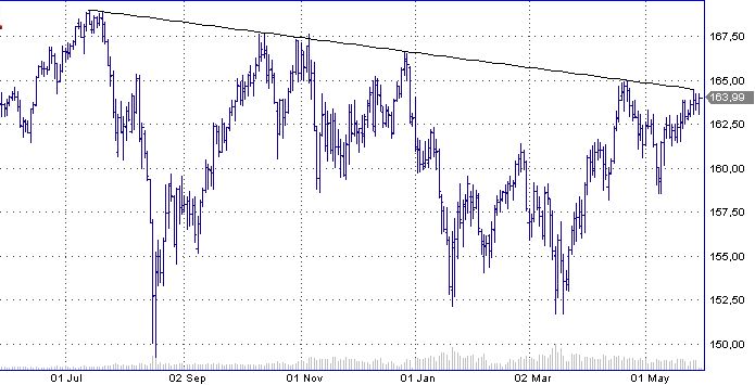 ... zur Zeit zeigt sich im Dow Jones und im Nasdaq ein gänzlich verschiedenes Chartbild.