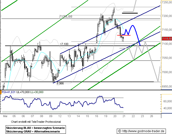 Dieses große Doji (kreuzförmige Kerze) in einem sich verjüngenden Trend (Keilform) ist aus charttechnischer Sicht ein gefährliches Warnzeichen. Anleger werden dieses erkennen und verkaufen, wenn das untere Ende des Dojis nach unten aufgelöst wurde (was heute bereits geschehen ist). Doch erst beim nachhaltigen Bruch der unteren Linie des Keils wird dieses Verkaufssignal auch bestätigt! Auch in diesem Fall werden wir wieder starken Verkaufsdruck erkennen.