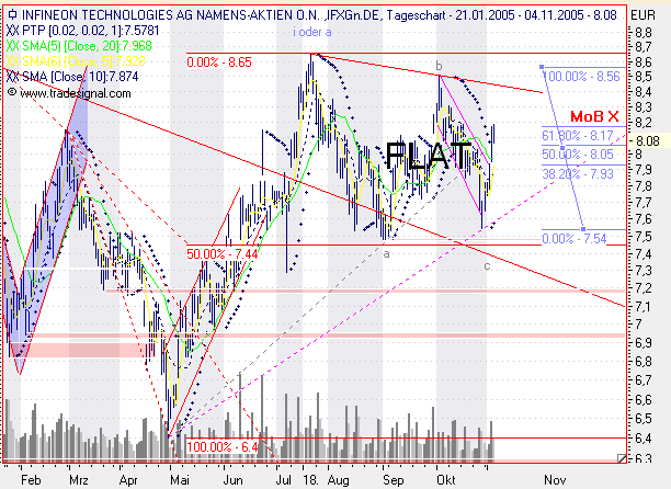 Diagnose: Die MAN Aktie startete im Oktober 2002 einen langfristigen Aufwärtstrend nach einem Tief bei 10,02 Euro. Im Juli 2005 durchbrach sie ihren primären Abwärtstrend und stieg dann in einer zügigen Bewegung auf ein neues AllTimeHigh bei 44,00 Euro. Von diesem Hoch aus setzte die Aktie bis fast an den primären Abwärtstrend zurück. In der 2. Oktoberhälfte bildete die Aktie an der Unterstützung bei 37,06 Euro einen kleinen Doppelboden aus. Dieser Doppelboden war Ausgangspunkt einer kurzfristigen Aufwärtsbewegung, in der Verlauf die Aktie heute den Abwärtstrend seit dem AllTimeHigh attackiert und zu überwinden scheint. Dieser Trend liegt bei 42,16 Euro.