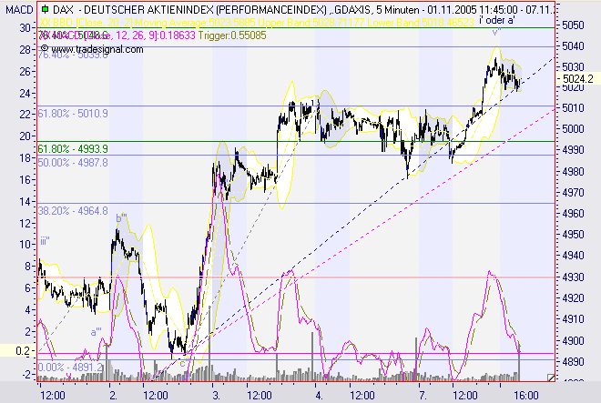 DAX Widerstände: 5065 (u), 5138 (u); Unterstützungen: 4929 (O), 4762 (u), 4726 (u), 4637 / 4623 (u); Aktuell angepasste Korrekturpotentiale, bezogen auf die Wegstrecke des aktuell gültigen Aufwärtsimpulses: