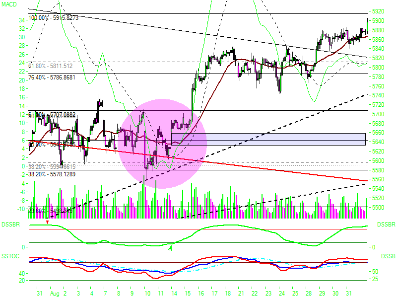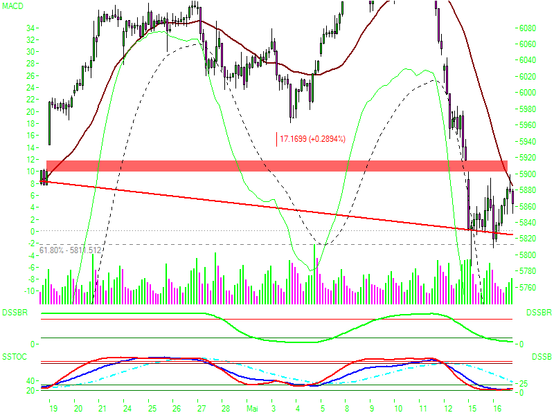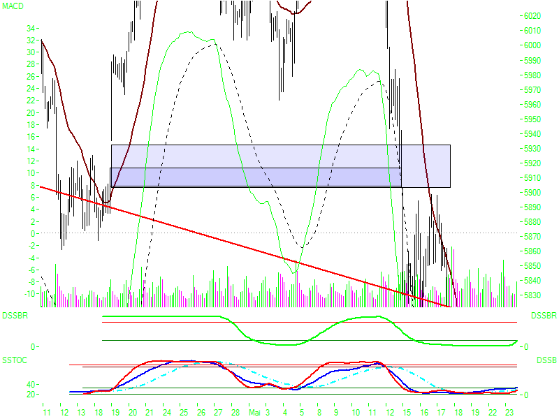 | | | Pivots, grafisch | | R3 | 5883,89 |  | | R2 | 5842,30 |  | | R1 | 5820,38 |  | | Pivot | 5778,79 |  | | S1 | 5756,87 |  | | S2 | 5715,28 |  | | S3 | 5693,36 |  |