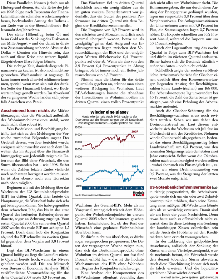 DAS PASST NICHT in das schöne Stimmungsbild, das die Aktienstrategen fast aller Banken zeichnen: Die US-Bankenkrise sei weit weg, gaben die großen deutschen Institute vergangene Woche in einer Umfrage der „Börsen-Zeitung“ unisono zu Protokoll; die deutsche Wirtschaft sei kaum betroffen. Allenfalls „leichte Bremsspuren“ wollen sie erkennen. Die Firmen hätten im dritten Quartal weiter gut verdient, die Bewertung der Aktien sei nach wie vor günstig. Einer Fortsetzung der seit 2003 praktisch ununterbrochenen Hausse stehe nichts im Weg. Und so setzen die Banken wieder Kursziele von bis zu 8800 Punkten bis zum Jahresende für den Dax.