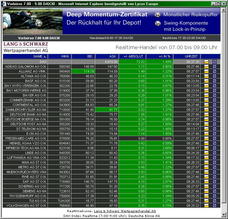 Börsentag auf einen Blick: FesterDAX: - FESTER - Nach besseren Vorgaben der Börsen in den USA und Japan werden auch deutsche Aktien DAX.ETR am Donnerstag fester erwartet. Der Dow Jones hatte am Mittwochabend nach Xetra-Schluss noch mehr als 140 Punkte hinzu gewonnen. In Deutschland stehen am heutigen Donnerstag die unerwartet guten Quartalszahlen von SAP SAP.ETR im Fokus. Der Softwarehersteller hat nach einem kräftigen Umsatz- und Gewinnplus im dritten Quartal die Prognose für 2005 teilweise angehoben und dürften den deutschen Markt damit zusätzlich stützen.