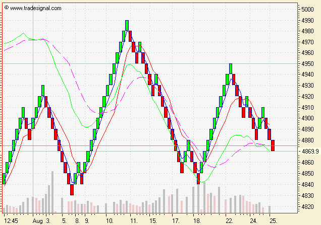 Die Kreuzunterstützung im Bereich der 4.480 Punkte führte zu einem kleinen Doppelboden auf Intraday-Basis. Das ist inzwischen der dritte kleine Boden dieser Art innerhalb der letzten 14 Handelstage. Gravierend war der Preisnachlaß aber gewiß nicht. Der trendtechnisch wichtige Unterstützungsbereich bei 4.850 Punkten stand nicht zur Disposition.