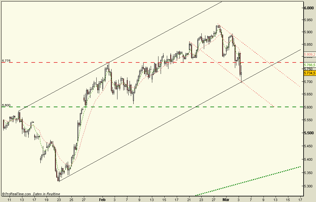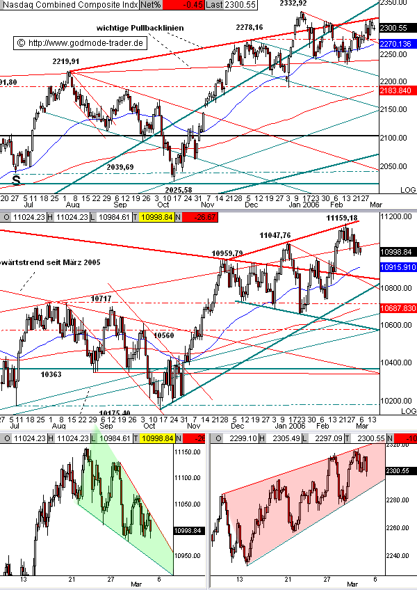 Die US Indizes haben den Handel heute schwächer eröffnet, können sich aber auf diesem Niveau behaupten. Gestützt wird der Markt dabei durch den Öl Sektor, relative Schwäche zeigt der Halbleiter Sektor und der Gold- und Silber Index. Der Nasdaq prallte gestern von einer wichtigen Pullbacklinie nach unten ab, notiert aber weiterhin über der maßgeblich entscheidenden horizontalen Unterstützung bei 2278,16 Punkten. Auch der Dow Jones gibt in der Anfangstendenz weiter nach. In den letzten Handelstagen kommt es zu deutlicheren Korrelationen der US Indizes. Im 60 Minutenchart läuft der Dow Jones in einen bullisch fallenden Keil hinein, während der Nasdaq Composite in einen steigenden bärischen Keil mündet. In der nächsten Handelswoche dürfte es zur Auflösung der Formationen kommen, die dann eine nähere Interpretation zulassen.