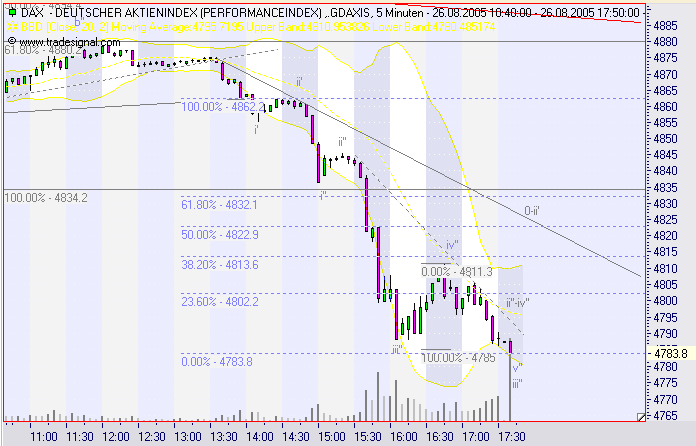 Jedoch halte ich dies für nicht sehr wahrscheinlich. Der DAX hat wohl etwas übertrieben und wird wohl Anfang nächster Woche zurücklaufen. Der Rücklauf wird uns einiges über die Verfassung des Marktes sagen. So deutet ein Rücklauf bis 4802 (23,6er RT)an das die Stimmung sehr bearisch ist und die komplette downwelle vielleicht nur die i einer größeren ist, deren Zielbereiche sich nach Abschluß der Welle mit der v' bestimmen lassen. Ein Rücklauf bis zum 38,2er RT 4813 wäre normal und ihr sollte die abschließende v' folgen die dann in den Bereich 4774-65 laufen könnte.