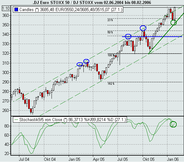 Eigentlicher Auslöser dieses Anstiegs waren die überraschend guten Zahlen von SAP. Allein der 9-10 % Anstieg von SAP am Mittwoch ließ den Dax nach oben schnellen und löste Kaufsignale aus. Dann kam noch Siemens am Donnerstag und führte zu weiteren Kurssteigerungen. Das gemischt mit der Meldung, dass der Iran vielleicht doch die strittige Urananreicherung nach Russland auslagert, verbunden mit einem fallenden Ölpreis und moderat steigenden Amis macht das explosive Gemisch perfekt. Heute kam dann noch ein guter Ausblick von Microsoft dazu.