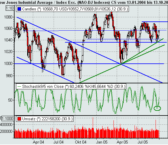 Wenig Einfluß auf den Schlussstand hatte der gestiegenen Ölpreis. Der November-Kontrakt auf Rohöl der Sorte Light, Sweet Crude stieg um 0,44 Dollar bzw 0,7 Prozent auf 66,79 Dollar je Barrel. Positiv wirkten sich die Daten zu den Erstanträgen auf Leistungen im Rahmen der Arbeitslosenversicherung aus, die saisonbereinigt um 79.000 auf 356.000 gefallen sind. Volkswirte hatten einen Anstieg um 18.000 erwartet. Das Ministerium hatte keine Erklärung für den kräftigen Rückgang der Zahl der Erstanträge.