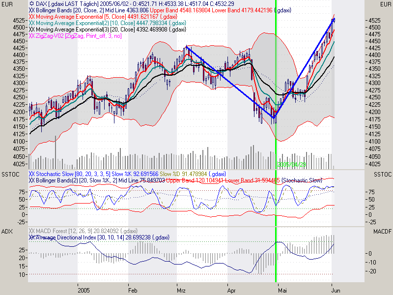 Was mich ja anfangs so begeistert hat waren die blauen und roten Pfeile, die für mich wirklich die optimalen Einstiege darstellen. Das Problem ist nur, das bei 3% Änderung der ZigZag erst nach 3% die Umkehrung findet. Das letzte Low war bei ca. 4160 und nach dem blauen Pfeil wäre man danach (am liebsten) long gegangen. Der ZigZag benötigt aber noch 3% bis er sich sicher ist und dann erfolgt der Einstieg frühestens bei ca. 4280. Wenn man jetzt beim Ausstieg wieder 120 Punkte verliert, wäre das eigentlich eine kleine Katastrophe. Stochastic und MACD werden anscheinend gar nicht benutzt? Für Day-Trading muß man nur die prozentuale Änderung anders einstellen, dann liefert der ZigZag auch brauchbare Ergebnisse. Habe ich jetzt noch etwas falsch verstanden? Ich würde nämlich sofort alles andere hinwerfen, wenn das System wirklich gut funktioniert.