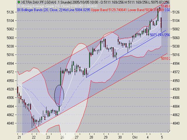Auf Tagesbasis werde eine hohe Schwungkraft angezeigt, mit steigender Tendenz. Gemessen über den klassischen RSI mit starren Grenzen für überkauft und überverkaufte Niveaus, wäre der DAX jetzt überhitzt, so der Stratege. Im Zusammenhang mit einem Kombinationsindikator aus RSI und Bolliger Band, wobei das Bollinger Band die starren Bewertungsgrenzen des RSI ersetze, sei der DAX aktuell nur leicht überkauft, es lägen keine Verkaufssignale vor.