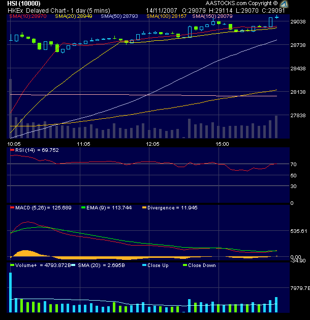 Ample Financial Group's Alex Wong says 1024-point rebound "not enough," index may try 30000 in short term; recommends buying petrochemical, airlines stocks as beneficiaries of lower oil prices. 38 of 40 blue chips higher with China plays back in vogue: China Mobile (0941.HK) +6.6% at HK$137.40, China Unicom (0762.HK) +6.2% at HK$15.44; both say they want to sell iPhone in China; Ping An (2318.HK) +5.7% at HK$95, Sinopec (0386.HK) +7.4% at HK$11.32.(RLI)