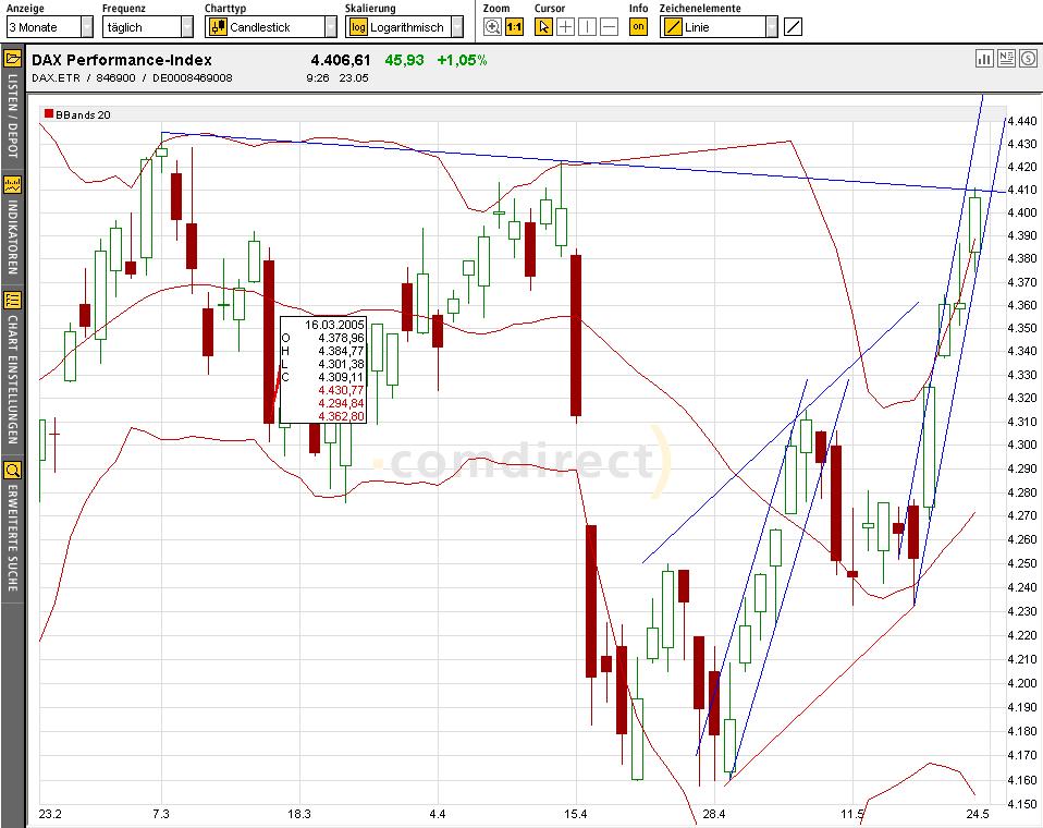 Nochmal etwas zum Thema long/short: Longs waren m.E. eigentlich die ganze letzte Zeit über riskanter, wenn man die Wellen lang- und mittelfristig betrachtet. In einigen Wochen werden wir sehen, wie riskant sie waren. Denn m.E. schwenken wir demnächst bei den Amis in eine 4 seit Oktober 2002 und beim Dax wahrsch. in eine 2 oder 4 seit März 2003 ein. D.h. es geht saftig runter. Nur weiß man noch nicht, wie weit es vorher noch rauf geht. Deswegen sind auch die shorts durchaus gerechtfertigt. Das hat nichts mit immerzu short Rufer zu tun. Es ist für die nächsten Wochen/Monate einfach Fakt, daß die gesamte Aufwärtsbewegung seit 2002/3 in ihre wahrsch. größte Korrektur einbiegt. Daß die Indizes vor ein paar Wochen nochmal den Kopf aus der Schlinge gezogen haben, war alles andere als zu erwarten, aber es ist nun mal passiert. Wer dies rechtzeitig geschnallt hat, hat sicher gut verdient und das ist auch gut so. Ehre, wem Ehre gebürt. Ist aber kein Grund der Gegenseite eins überzubraten, schon gar nicht, wenn man Vollidiot heißt und mit 20 Papierschnipsel voll investiert ist.