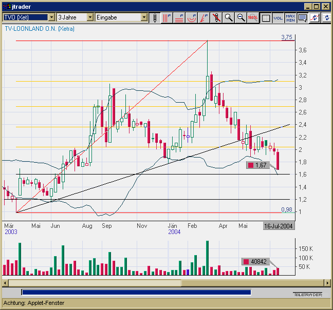 TV-Loonland macht derzeit einen angeschlagenen technischen Eindruck. Der Aufwärtstrend seit April 2003 wurde im Mai 2004 verlassen, eine schnelle Rückkehr scheint unwahrscheinlich. Prinzipiell bieten sich jetzt zwei Optionen für die weitere Entwicklung an: