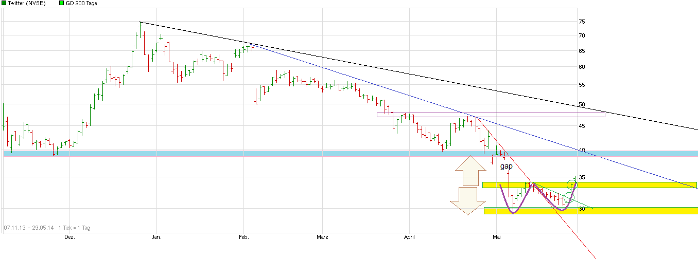 Bin erst seit gestern vormittag long mit dem Teil -> DT0Z5E . Könnte sich langsam ein Boden gefunden haben nach der Kurshalbierung. Aktuell sieht es nach einem möglichen Doppelboden / W-Formation aus. Wenn ich mal die Rangespanne 29,50/34,50$ zu 100% nach oben an die mögliche Nackenlinie des Doppelbodens projeziere, dann käme man auf ca. 39,50$ als mögliches Zielgebiet. wäre ungefähr der Bereich wo man im Nov 2013 war. Aktuell gab es zwei Upgrades in den letzten beiden Tagen (KZ40, KZ43). Dürfte den Kurs sicher mitangeschoben haben die letzten zwei Tage. Opening Gap heute liegt bei ca. 33,80. Mal schauen, ob man es zu macht und dann wieder hochsteigt. Wäre schon gut, wenn man nicht mehr nachhaltig unter die Nackenline der W-Formation auf SK Basis ginge. Wenn ich den Eindruck bekomme man kommt die nächste Zeit doch nicht nachhaltig über die W-Formation raus, dann würde ich aber erstmal wieder glattstellen bis neue klarere Signale kommen