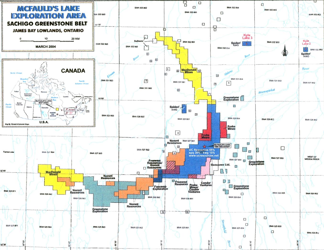 Richard Hamelin, Präsident von UC Resources und Neil Novak, Vizepräsident für Exploration und Präsident von Spider Resources, begleitet von Dr. James Franklin, P. Geo. (Vorstand von Spider), besuchten kürzlich das Projekt. Herr Hamelin hält für UC fest: „Ich bin extrem aufgeregt durch die kürzliche Entdeckung durch Noront Resources (NOT), diese Entdeckung sollte das McFauld’s Gebiet öffnen, von welchem wir immer geglaubt haben, dass es das Potenzial hat, ein grösseres Bergbau-Camp zu beherbergen. Wir erwarten unruhig unsere Untersuchungsresultate des erwähnten Bohrprogramms und antizipieren, dass wir in der Lage sein werden, diese Resultate in naher Zukunft zu veröffentlichen. UC und Spider sind aktuell daran, einen aktualisierten NI 43-101 Bericht fertig zu stellen, welcher die Projektresultate bis jetzt zusammen fasst, und wir werden diesen einreichen, sobald er fertig ist. Zusätzlich war ein Repräsentant von RPA Scott Wilson an Ort, um das Projekt zu überprüfen, wie es für ihre unabhängige Überprüfung und Schätzung des Ressourcenpotenzials der zwei massiven Sulfidzonen, auf welchen schon historische, wie auch aktuelle Bohrungen niedergebracht wurden/werden, notwendig ist. Die Ressource wird aktualisiert, während das Bohrprogramm während des Rests der Feldsaison weitergeführt wird“ [Es gibt noch keine Untersuchungsresultate von der jüngsten Entdeckung durch Noront, es besteht also keine Garantie, dass es irgendwelche Resultate von ökonomischer Signifikanz geben wird.]