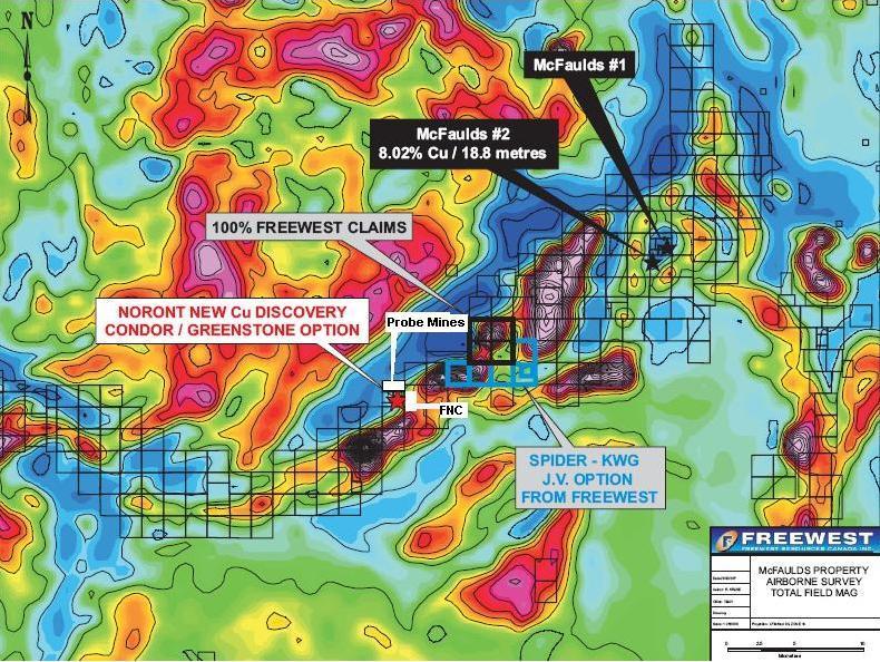 Das McFauld’s Lake VMS Projekt wurde ursprünglich in 2002 entdeckt, während Spider, KWG und De Beers Canada Exploration Inc. das Projektgebiet nach Kimberliten absuchten. De Beers hält eine 1,5%ige Netto-Schmelzgebühr am Projekt, von welcher durch Spider und KWG für 1,5 Millionen CAD 0,5% von De Beers zurück gekauft werden können. Die Claims, welche für die Untersuchung des oben erwähnten Perimeters abgegrenzt wurden, definieren die Liegenschaft, auf welcher De Beers das Recht auf Schmelzgebühren hat. Bis jetzt wurden auf dem Projekt 10 isolierte VMS Vorkommen identifiziert und durch Bohrungen getestet, von welchen zwei (McFauld’s