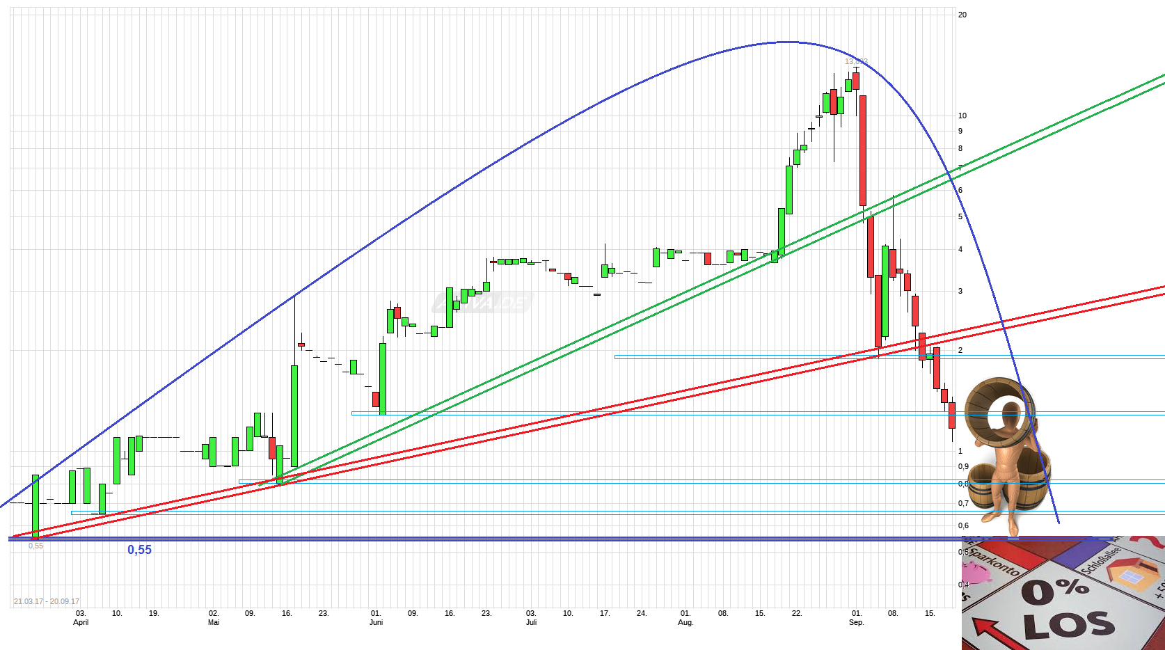 Ist natürlich bei einem derartig kleinen MicroCap nur sehr bedingt möglich saubere CT anzuwenden. Aber z.B. bei ca. 0,8 wäre auch nochmal ein Zwischenhalt denkbar. Aber am "saubersten" wäre vielleicht doch man würde sich bei dem Parabelflug einfach wieder erstmal dahin begeben wo das Ganze mal war bevor der luftlleere manipulierte Push begonnen hatte den die BaFin jüngst aufs Korn nahm. Das wäre der Bereich um 0,55€. Aber selbst im dem Bereich wäre man fundamental gesehen noch immer nicht günstig angesichts der totalen Substanzarmut und den fehlenden operativen Erfolgen. Das Ding ist in erster Linie wohl nur ein Zockerspielzeug gewesen bei dem sich gewisse Herrschaften die letzten Monate die Taschen gut gefüllt haben dürften. Denke es ist auch nicht so schwer zu erraten wer da zum Kreis der Verdächtigen gehören könnte. Wird natürlich immer irgendwelche Zocker geben die sobald die ein Position frisch gekauft haben sofort "selbstlos" posten der Rebound ist da, springt alle hinterher. Aber letztendlich suchen die nur schnell gierige Narren die einem die Posi mit Gewinn wieder zügig abkaufen und nicht weil sie kaufen aus Überzeugung hier hätte etwas längerfristig seinen Boden gefunden. Muß jeder selber wissen wie er sich hier jetzt weiter verhalten will. Man sollte nur bedenken, daß Aktien nicht deswegen günstig werden, weil sie zuvor stark fallen sind. Egal wie tief eine Aktie fällt, sie kann von dem Punkt wo sie gerade ist jederzeit um 100% weiter fallen.