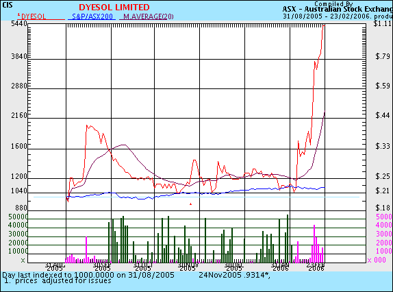 wird nur in Foren heiss diskutiert,kam im August als IPO Dyesol DYE in Australien raus , www.asx.com.au/asx/markets/...=get&template=F1001&ASXCodes=DYE Solar energy firm Dyesol Ltd says it wants to demonstrate that there are safe, cheap and effective alternatives to fossil fuels, after making a solid debut on the Australian Stock Exchange He said Dyesol was looking forward to a climate of "peaceful co-existence" with companies advocating the adoption of other alternative energies, including uranium miners.blabla zuerst über 45$ jetz unter 30$ ,auch die Homepage gibt nur wenig her