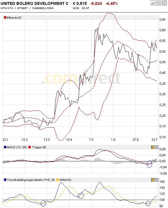 Hier mal der D Chart. Wir befinden uns am oberen Bollinger. Also wenn Volumen reinkäme, könnten wir vielleicht einen weiteren Anstieg sehen heute. Dazu müsste die 0,57 jedoch auch einmal auf sk Basis genommen werden. Meine Meinung,-)