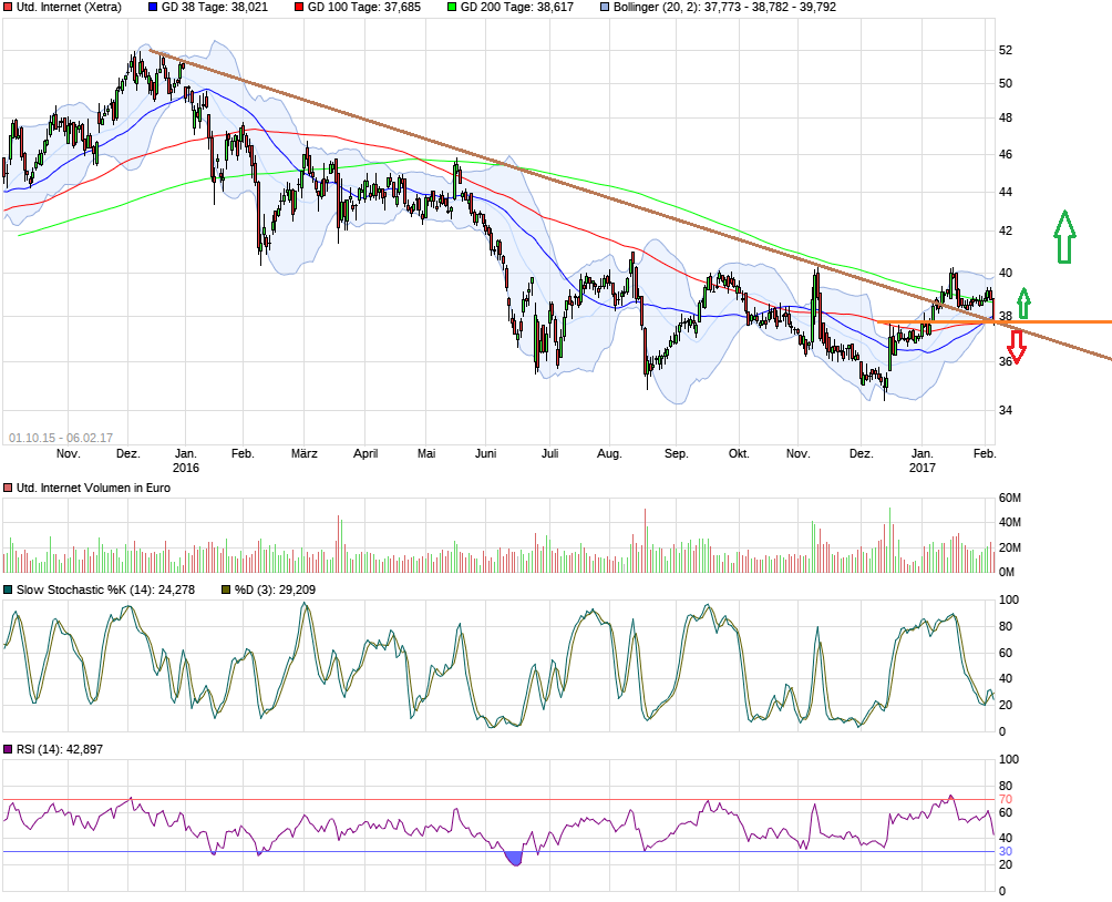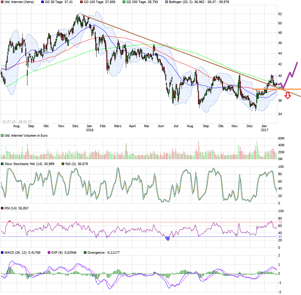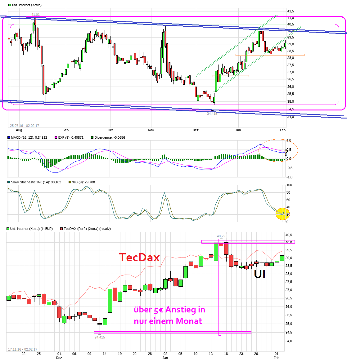 Charttechnik kann übrigens nie hinfällig sein, sondern würde dann halt nur ein anderes Signal liefern. Bisher war ja meine Annahme man würde nur zum Ausbruchniveau zurücklaufen okay. Jetzt darf es aber keineswegs tiefer gehen. 37.7 € war mein bevorzugtes Korrekturniveau, wo man heute minimal drunter war. Es muss jetzt hochgehen, sonst siehts wirklich nochmal nach Kursen von rund 35 € aus. Fundamental für mich im Gegensatz zu vielen anderen Aktien, die in den letzten Monaten hochgelaufen sind, aber nicht verständlich. Was an UIs Bewertung im Vergleich zur Perspektive so teuer sein soll, ...
