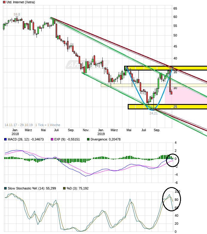 Sollte man ungünstigerweise also noch weiter zurücksetzen, dann wäre aus technischer Sicht wichtig spätestens im Bereich um 25€ wieder einen Rebound zu starten, damit man sich so zumindest die Chance auf einen potenziellen Doppelboden erarbeitet. Was das Chartbild auf der anderen Seite wieder schrittweise aufhellen würde, kann man ja auch unten der Grafik entnehmen. Noch gibt es kein echtes klares Zeichen der Boden wäre gefunden. Hoffe aber mal, daß man nicht wirklich nochmal die Region der alten sommerlichen 2019er Tiefs anläuft.