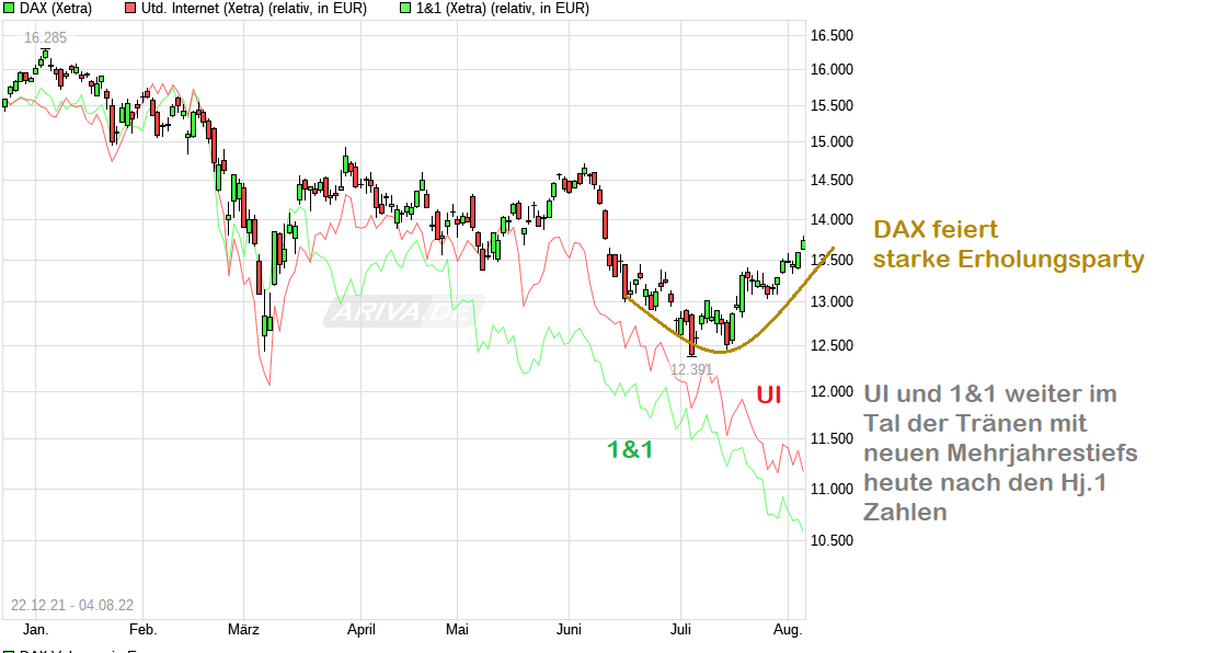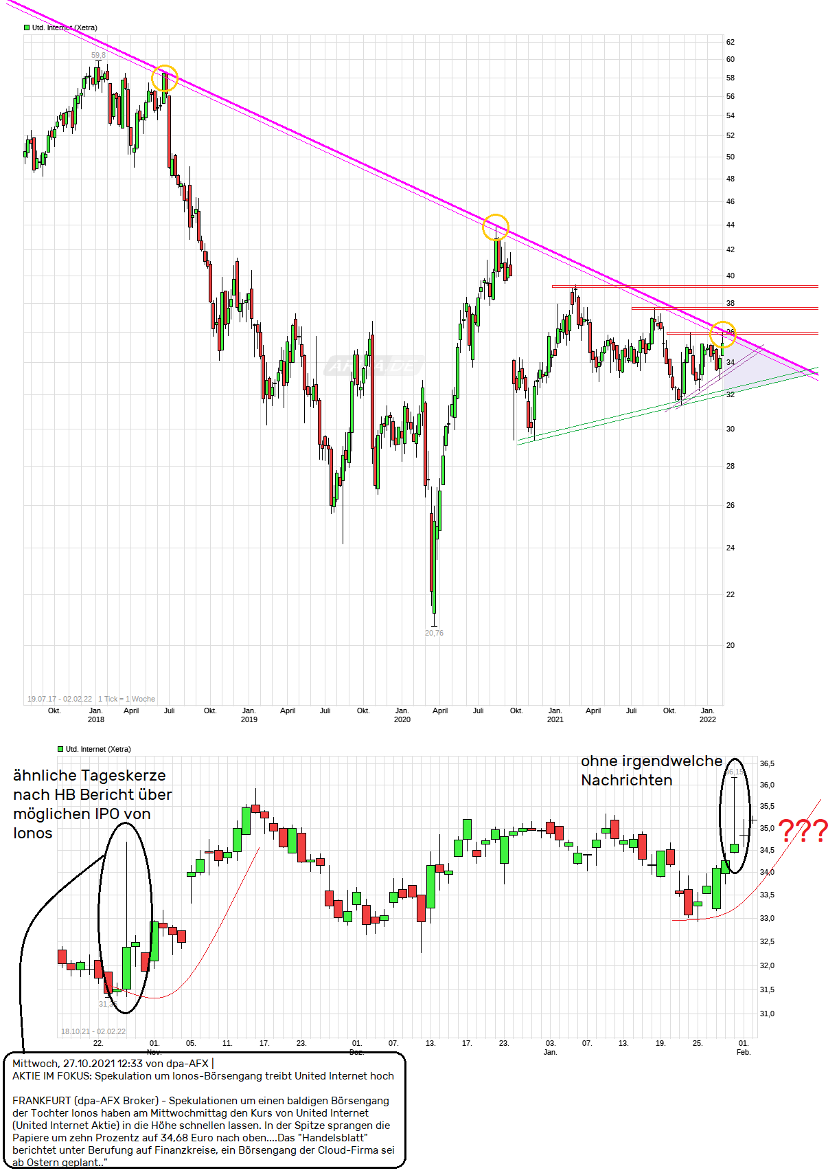 Sollte also die Gesamtbörse bzw. das Börsenumfeld auch nach Ostern noch vorteilhaft bleiben, dann ist vielleicht doch schon bis zum Sommer 22 ein IPO denkbar. Muß man mal abwarten was wirklich passiert. Aber es könnte natürlich sein, daß der Markt die Wahrscheinlichkeit für einen nahenden IPO zunehmend höher ansieht und entsprechend zunehmend antizipierend schon in den UI Kurs dann auch einarbeitet. Wäre natürlich schön, wenn dabei jetzt dieser seit 2018 fallende Abw.trend wirklich geknackt würde und das Teil sich doch mal weiter nördlich bewegt. Kommt natürlich auch parallel darauf an, daß bei 1&1 nicht der Kurs noch tiefer fällt.