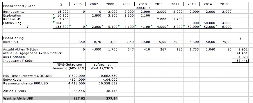 Da die Finanzierung einstweilen gesichert ist, das technische Risiko mit kompetenten und finanziell potenten Partnern (Sintez, Halliburton, Schlumberger) angegangen wird, das politische Risiko in Namibia nicht ins Gewicht fällt und der Zeitfaktor bis zur Förderung durch adäquate Abzinsung berücksichtigt ist (NPV-Methode), wage ich mit gutem Gewissen die Aussage, dass es mittlerweile sehr gut mit diesem Investment aussieht. Insbesondere auch deshalb, weil hier ein Explorer mit einer Ressourcenchance von 5,1 Mrd. USD in einem der besten Gebiete Afrikas für schlappe 19,7 Mio. USD, das sind 0,38 % der Ressourcenchance, zu haben ist.