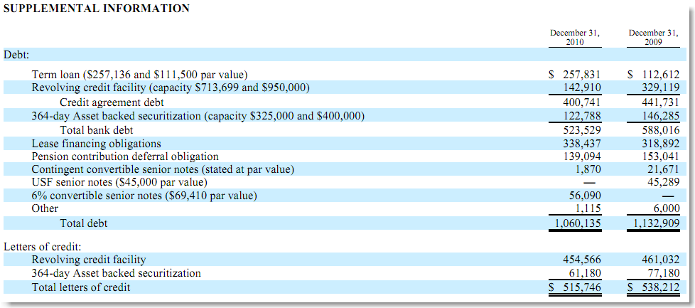 YRC ended 2010 with almost $1.5 billion in debt and obligations, yet generated full year cash flow of only $1.1 million. Also, YRC also faces a critical Feb. 28 deadline to qualify for debt restructuring or some other “qualifying transaction” as part of an agreement with the Teamsters. The qualifying transaction must be in place by March 15.