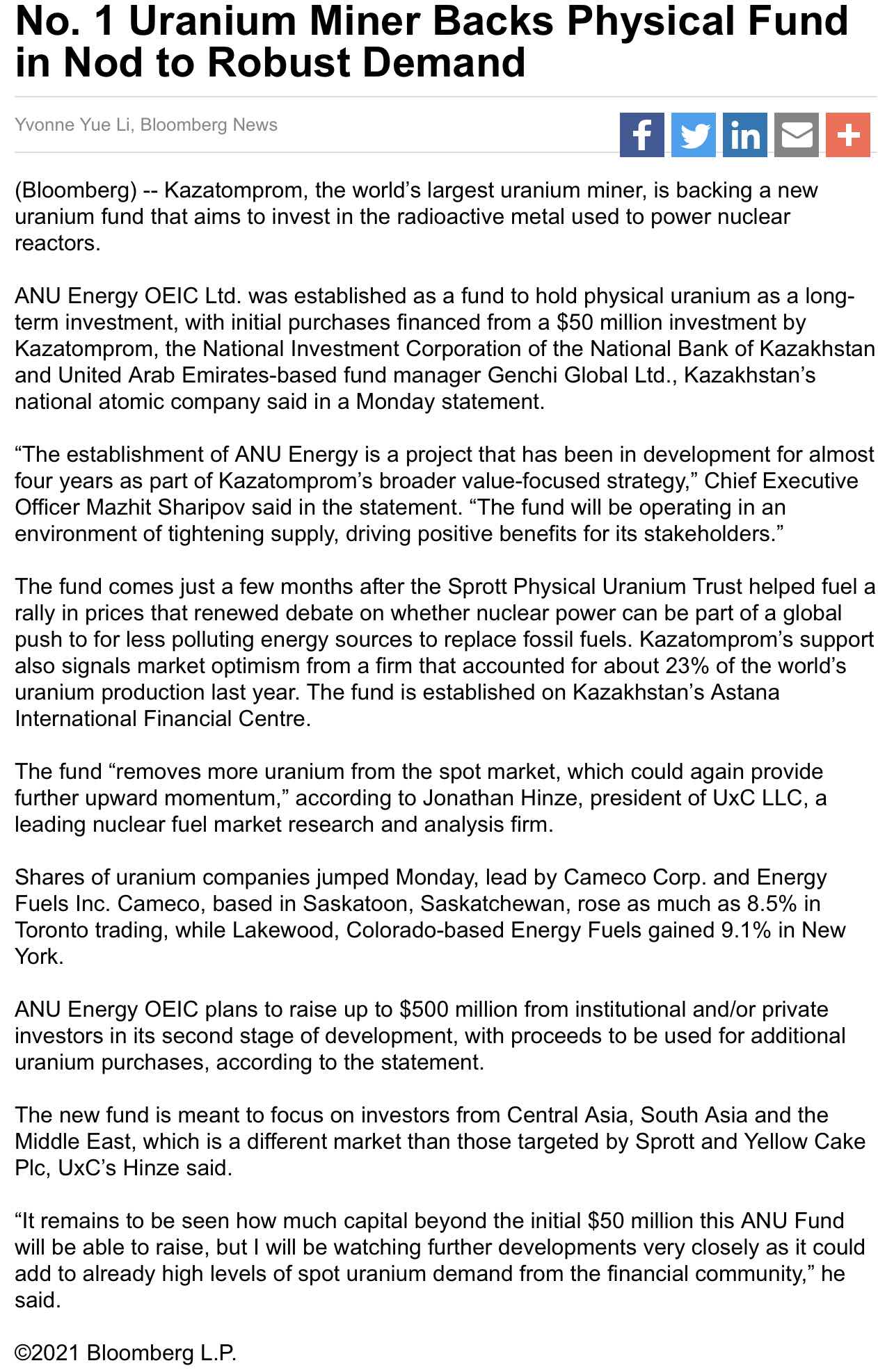 VANCOUVER, BC , 9. November 2021 /CNW/ - Uranium Royalty Corp. (NASDAQ: UROY) (TSXV: URC ) (" URC " oder das " Unternehmen ") freut sich, das folgende Update über die Langer Heinrich-Mine, an dem Uranium Royalty Corp. eine Produktionslizenz von 0,12 AUD pro Kilogramm U 3 O 8 hält, das aus der Mine Langer Heinrich produziert und von Paladin Energy Limited (ASX:PDN, OTCQX:PALAF) ("Paladin") und Paladin Energy Metals verkauft wird GmbH: