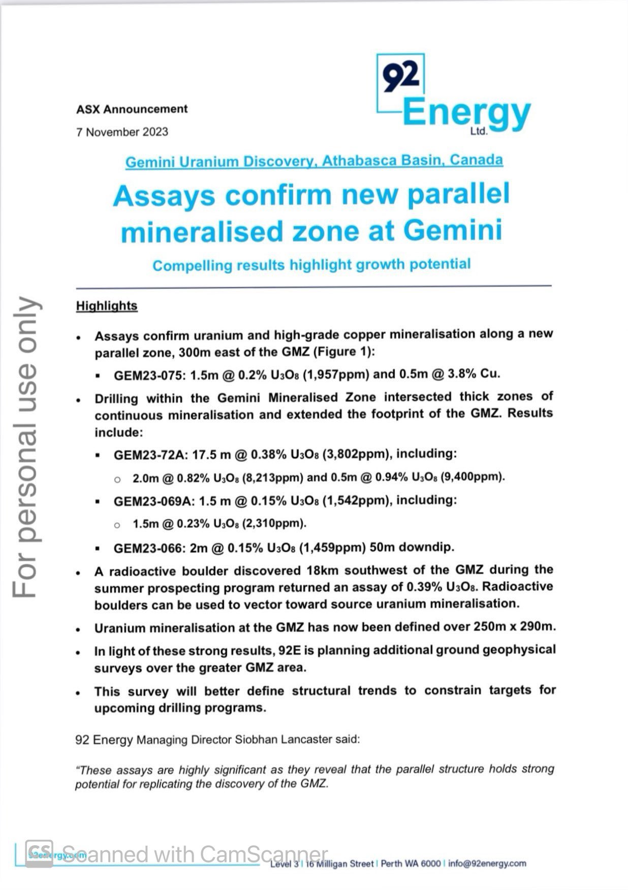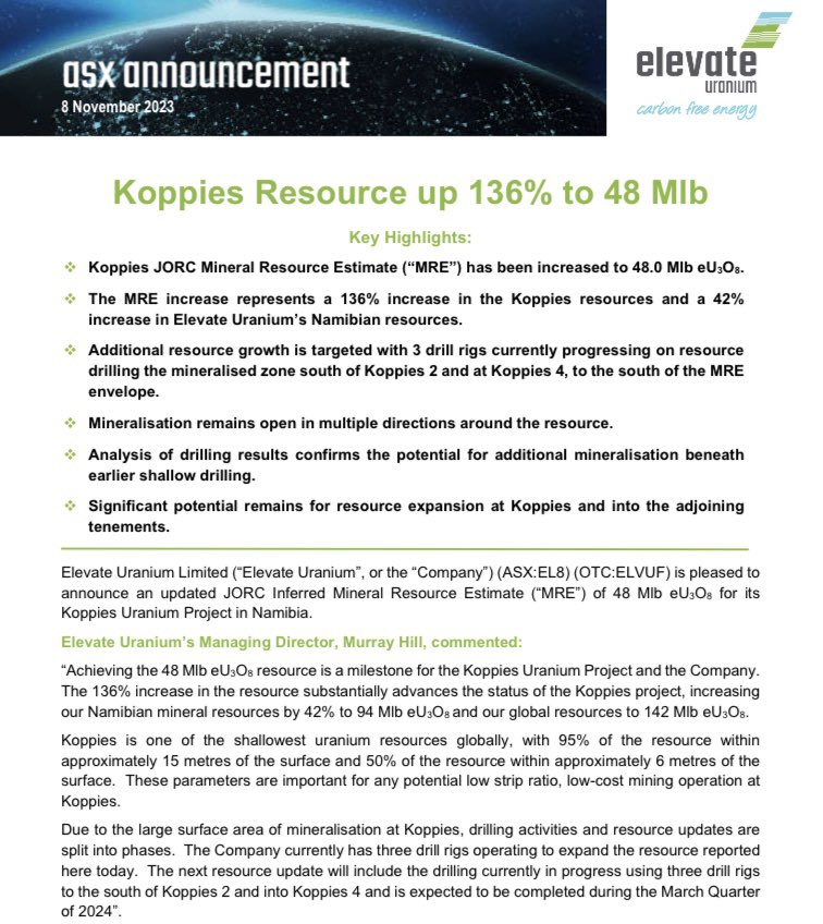 Die Mittel, die zur Tilgung der Schulden gegenüber Energy Fuels verwendet wurden, wurden durch Verkäufe im Rahmen des At-the-Market (ATM) Aktienangebotsprogramms des Unternehmens erhalten. Zwischen dem 19. September 2023 und dem 3. November 2023 gab das Unternehmen insgesamt 13.381.353 Aktien zu einem Durchschnittspreis von 3,23 USD für einen Bruttoerlös von 43.232.950 USD aus. Aus diesen Erlösen wurden 40.000.000 USD oder 12.383.901 Aktien verwendet, um den Kapitalsaldo auf der ausstehenden Note zu reduzieren. Die Verwendung des Geldautomaten für die Rückzahlung mit 3,23 USD pro Aktie anstelle der Umwandlung mit 2,91 USD führte zu Einsparungen von 1.361.804 Aktien, die derzeit auf über 4.00.000 USD geschätzt werden. Das Unternehmen sparte auch über die ursprüngliche Laufzeit des Darlehens über 4.300.000 USD an Zinszahlungen.