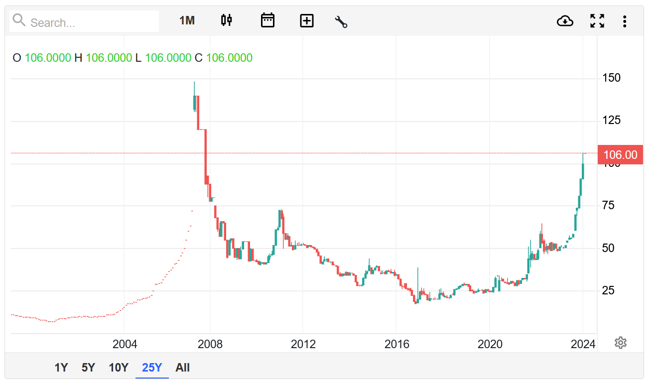 Was wir in nächster Zukunft sehen werden ist eine Abkehr von Cameco, hin zur zweiten und dritten Reihe kleine Produzenten und Developer, weil Cameco's Zahlen kein großes Wachstum mehr aufweisen werden.Sie sind mit ihren LT Verträgen aktuell über Jahre ausverkauft.Die einzige Chance liegt jetzt in der Vollauslastung um etwas vom Spotpreis zu profitieren.