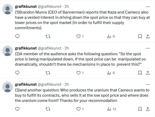 Brandon Munro (CEO von Bannerman) berichtet, dass auch Kaza und Cameco ein großes Interesse daran haben, dass der Spotpreis runtergedrückt wird, damit sie zu günstigeren Preisen am Spotmarkt kaufen können (um eingegangene Lieferverpflichtungen zu erfüllen). Hierzu stellt ein Zuhörer folgende Frage: