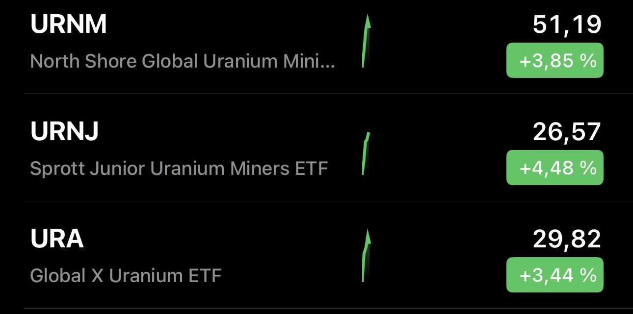 (Ich selbst kann am Montag nicht traden, da ich einen deutschen Broker habe, bin quasi handlungsunfähig. Habe deshalb am Freitag vorsichtshalber ein paar wenige UUUU verkauft. Der Zukauf der >1,2 Mio. Stk. von URNM, trotz Eliminierung von 130T ETF - Anteilen, und das hohe Volumen an der NASDAQ von >6,5 Mio. Stk. werte ich mal als positiv(?). Sollte nächste Woche der Kurs von UUUU, wegen des nun gefallenen Spotpreises und des SPUT-Rückgangs genau zu Börsenschluß, wieder rückläufig sein, werde ich wahrscheinlich die doppelte Menge von meinem Freitagsverkauf wieder zurückkaufen).