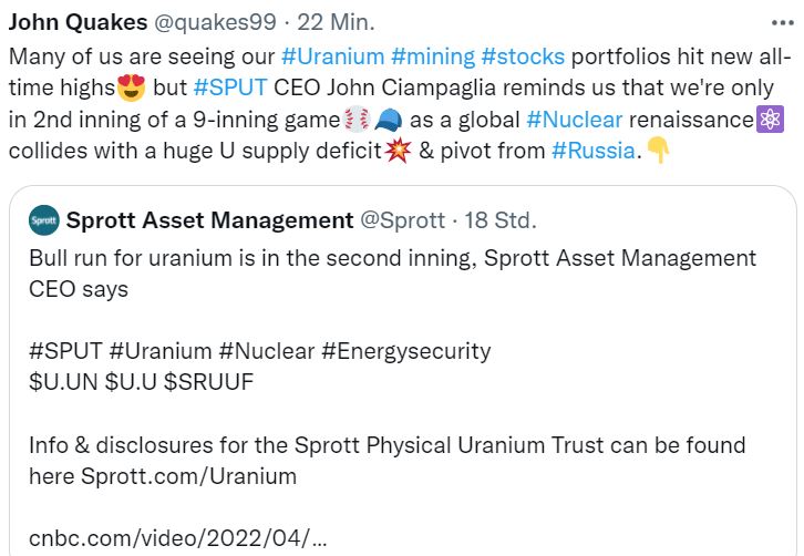 Das Unternehmen wird 125.000 Pfund Urankonzentrat aus seinem physischen Uranbestand liefern, um die Lieferung im Rahmen seines Liefervertrags 2022 abzudecken. Die Lieferung wird diese Woche erfolgen und einen Umsatzerlös von über sieben Millionen Dollar (7.000.000 $) generieren.