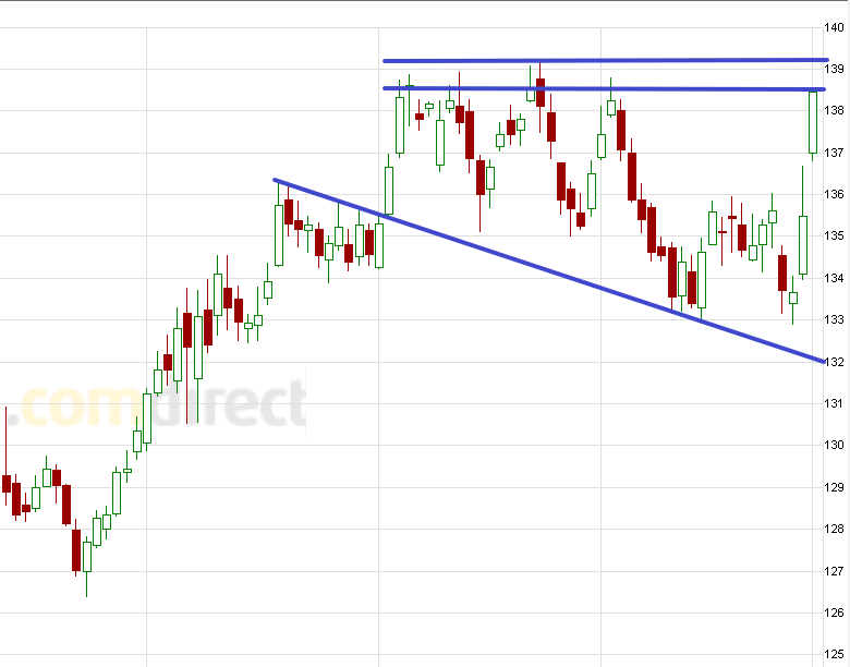 Tradingvorschlag/Alternative: Ein erneuter Test von 1,3944 ist nicht ausgeschlossen, ein Überschreiten per Stundenschluss würde den Ausbruch jedoch negieren. Vorschlag für den SL wäre 1,3953.