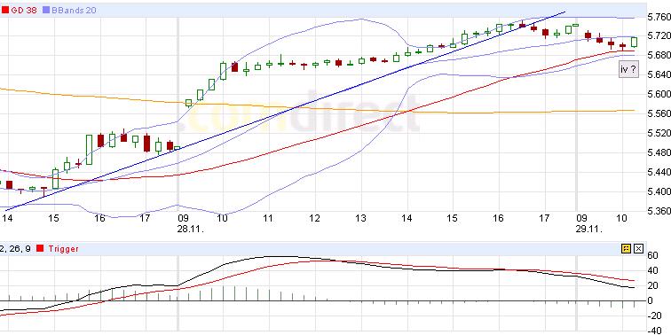 Dies stimmt mich vorsichtig. Der Ausbruch wurde heute bei knapp 1,34 vertagt. Es könnte nun wieder ein weiterer Test der unteren Keilbegrenzung bei aktuell 1,3238 anstehen. Dies wird spruchreif, sollte die untere GAP-Kante bei 1,3275 NICHT halten.
