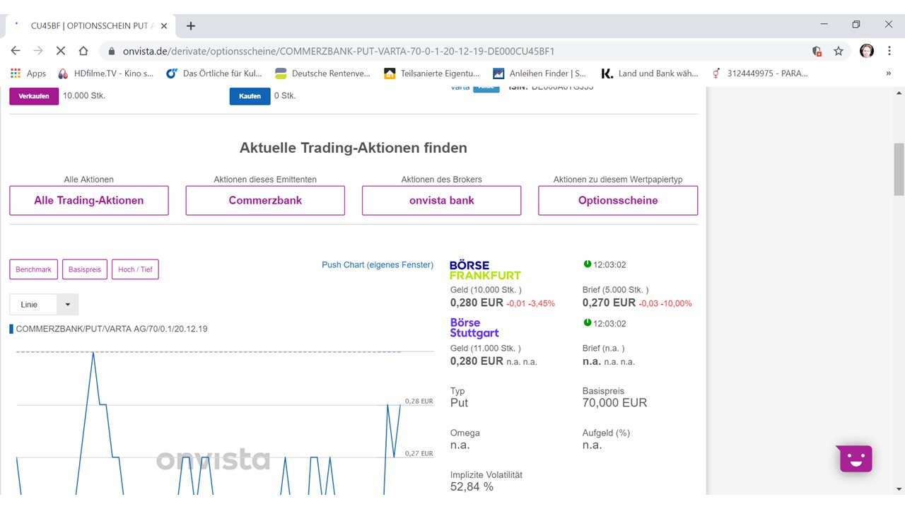 Wollte Commerzbank mit Ihren Put-Optionsscheinen auf die VARTA-Aktie Geld verdienen? Dies hätte dadurch erreicht werden können, dass die innerhalb der letzten 2 Wochen ausgegebenen Puts stark sinken und die Verkäufer unter hohem Verlust von 50% und mehr an die Commerzbank zurückverkaufen mussten. Der Aktienkurs dieser relativ kleinen und umsatzschwachen Aktie könnte durch Käufe/Verkäufe relativ leicht manipuliert werden. Die Commerzbank wollte selbstverständlich steigende Kurse um mit den Puts Geld zu verdienen.