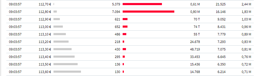 Hat jemand mal ins Orderbuch geschaut, was da bei der Marke von 113 Euro los ist? Jeder Angriff wird seit Wochen da abgefischt.