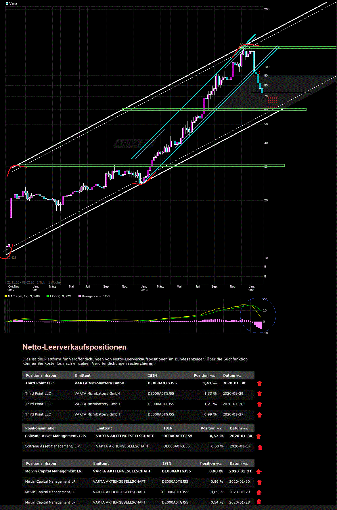 Na ja, potenzielle Luft wäre sicherlich nach unten erstmal noch weiter vorhanden, besonders wenn die 72,6€ auf SK nachhaltig fallen würde. Allerdings müßten für deine genannten Kurse von 50€ oder 25€ wohl schon extrem negative Dinge passieren auf der operativen Seite von Varta. Denke daher sollte man doch eher erstmal "harmlosere" Varianten in Betracht ziehen. Da könnte ich mir eher erstmal vorstellen, daß man z.B. in tiefe 60er Bereiche noch reinlaufen könnte, wenn der Gesamtmarkt die nächsten Wochen noch weiter die extremen Anstiege des Jahres 2019 abbaut auf verträglichere Größen. ( =>The main reason for the stock market’s decline is NOT the coronavirus - MarketWatch - https://www.marketwatch.com/story/...-27?siteid=yhoof2&yptr=yahoo , https://s19.directupload.net/images/200203/fazasoqz.jpg ). Wäre dann ca. 50% Korrektur von dem fundamental entrückten Varta-Allzeithoch( würde vielleicht damit auch die Fibo-Freunde zufriedenstellen) und selbst mit so einem zurückgekommenen Kurs wäre man noch immer in einem Trendkanal mit zügigem Anstiegstempo, wenn man von da wieder dynamisch abprallen würde. Die letzten Tage sind ja massiv verschiedene Leerverkäufer eingestiegen und haben auch mehrfach ihre Positionen dann weiter ausgebaut. Machen die sicherlich nicht im Einstiegsbereich von 75/80€ wenn die nurnoch wenige Euros an Rückgang erwarten, sondern wohl eher um auf Kurse deutlich unter der 70€ Marke zu wetten. Ist schon sehr auffällig, daß diese LV nun gleich im Rudel jetzt erst auf den Zug springen und so hektisch schnell weiter aufbauen. Ob da irgendwo im Hintergrund schon etwas an Insider-Infos durchgesteckt wurde was die normalen Anleger erst verzögert zu hören bekommen? Wie dem auch sei, längerfristige Verkaufsignale dominieren erstmal noch. Von daher drängen sich Käufe aus rein technischer Sicht aktuell noch nicht sonderlich auf solange keine belastbaren Umkehrsignale kommen, der Gesamtmarkt noch weiter konsolidiert und dabei hochbewertete Aktien natürlich stärker korrekturgefährdet bleiben.