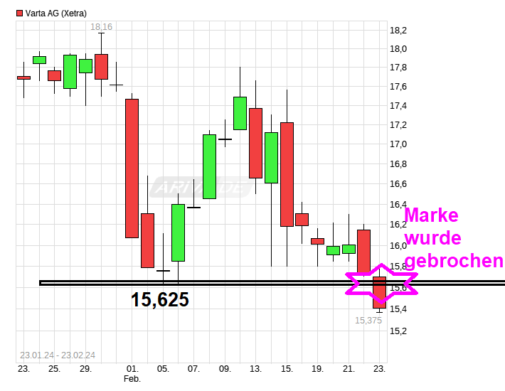 Varta Aktie: Das Kursrisiko bleibt weiter hoch! 23.02.2024 - www.4investors.de/nachrichten/...?sektion=stock&ID=175286 "....Charttechnisch steht weiter die potenzielle Unterstützung bei 15,62/15,80 Euro im Fokus, die sich im Laufe des Februars herauskristallisiert hat. Hier konnte sich der Aktienkurs Anfang des Monats stabilisieren und nach einem kleinen Pullback auf 17,805 Euro liegt die Marke nun wieder im Blickpunkt..... Charttechnisch hält 15,62/15,80 Euro bisher, doch die Frage bleibt, ob der neue Support stark genug ist oder neue Verkaufssignale eine Frage der Zeit sind? Ein Rutsch hierunter würde das charttechnische Bild weiter verschlechtern und den tertiären Abwärtstrend der letzten Wochen bestätigen. Käme es bei 15,62/15,80 Euro zu weiteren Verkaufssignalen, so könnte Vartas Aktienkurs erneut in Richtung des Baissetiefs aus dem Juni 2023 bei 13,825 Euro und die hier liegenden Unterstützungen fallen.