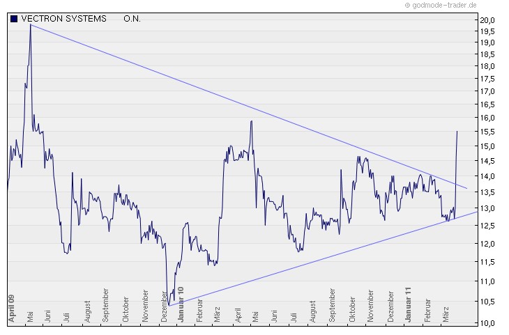 Die gestrigen News sind aufgrund der Katastrphe in Japan untergegangen. Wenn die Märkte sich beruhigen (Japan spielt für Vectron keine Rolle!) wird die Aktie deutliche Impulse nach oben bekommen....
