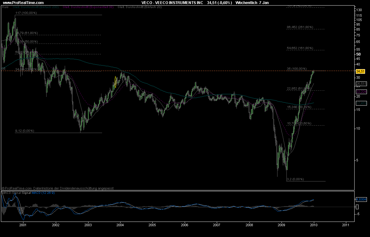 Danke erstmal für Deine Arbeit ! Einige Gedankensplitter dazu: Veeco steht ja inzwischen bei 37.11 - durch die 35 ging's ziemlich glatt durch. Eher kein Indiz für einen manifesten Widerstand also.....ich zweifle auch irgendwie daran, ob die 2000'er Kurse eine effektive technische Ableitung stellen können. Der Kontext damals war doch ein ganz anderer, in jeder Hinsicht (VEECO verfolgt zudem ähnlich wie AIX einen anderen Fokus in Entwicklung + Produktion als damals, auch die Nachfrageseite ist wesentlich ein andere). Ich denke, die Konsequenz aus den 2000er Vorgängen war eher psychologischer Natur - eine Art Malus für 'Neue Markt Überlebende'. Ein Malus, der sich womöglich nun umzukehren beginnt... Veeco gehört klar zu den Topperformern der letzten 12 Monate, zuletzt deutlich besser als AIX - nur noch vergleichbar mit Aktien wie Dialog...möchte mal einen Daytrader oder auch ein HS kennenlernen, die dergleichen überbieten können... Schade, dass Du zu 22 nicht zugeschlagen hattest. Hatte ja darauf hingewiesen, dass mir der Kurs primär nachrichtengetrieben scheint - und die Nachrichten sind hier eben noch besser als die von AIX...