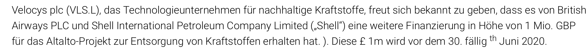 Dieses ungesicherte Darlehen wurde vergeben, um die US-Lohnkosten von Velocys kurzfristig zu decken. Es handelt sich um ein unbesichertes Darlehen mit einer Laufzeit von 2 Jahren und einem Zinssatz von 0,98%. In den ersten sechs Monaten sind keine Zins- oder Kapitalzahlungen fällig. Das Darlehen kann jedoch „vergeben“ werden und kann auf Antrag von Velocys 60 Tage nach Erhalt nicht zurückgezahlt werden, wenn es zur Bindung von US-Mitarbeitern und zur Aufrechterhaltung von US-Lohnkosten in Höhe von mindestens diesem Betrag im Zeitraum bis Ende Juni 2020 verwendet wird. Velocys ist zuversichtlich, dass es die Kriterien für diese „Vergebung“ erfüllen wird.