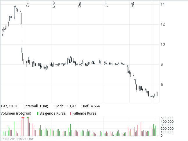 Aktuell bildet die Aktie einen Boden zwischen 4,70 Euro und 5,00 Euro aus. Ein erster Erholungsversuch ist verpufft. Aktuell drängt sich kein Einstieg auf, spekulativ orientierte Anleger sollten allerdings die Aktie unbedingt auf der Watchlist haben.