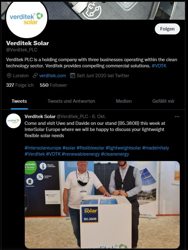 Die an der AIM notierte Verditek plc ist eine Holdinggesellschaft eines Unternehmens, das im Bereich der grünen Technologie tätig ist. Das Unternehmen konzentriert sich auf die Kommerzialisierung unseres Geschäfts mit leichten Low-Profile-Solarmodulen. Mit der Fertigung in Lainate Italien haben wir für unsere Kunden lösungen für erneuerbare Energien entwickelt, die Solarenergie in Anwendungen treiben, die bisher unerreichbar waren. Die außergewöhnlichen Eigenschaften unserer Solarmodule ersetzen Dieselkraftstoff in Unternehmen wie verderbliche Warentransporte, netzferne Telekommunikationstürme, Ladestationen für Elektrofahrzeuge, Stromversorgungslösungen für Wohn- und Ferienhäuser und Solardächer für leichte Industriedächer. Zusätzlich zu unseren aktuellen PV-Modulen in der Produktion haben wir uns mit einem herausragenden Marktführer in der Graphentechnologie, Paragraf, zusammengetan. Wir arbeiten zusammen, um die Technologie für die Kommerzialisierung zu entwickeln.