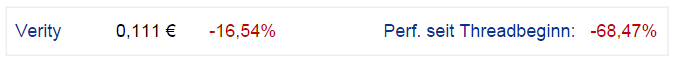 Wir reden von der OTC - Haifischbecken ohne Ende, 2 % reale Werte (wenn es denn hinkommt ;-)) . Jeder der meint das er Geld investieren will sollte gerade bei OTC, Pinksheets von einem möglichen Vollverlust ausgehen PUNKT. ich bin schon lange bei Aqualiv bzw. Verity dabei. Damals war noch ganz der große Focus auf Aqualiv "Wunderwasser" Schiss. Mein Gott ich hab nie gedacht das es was wird bzw. ein reales Produkt ist (hocuspokusdreck). Nur gehofft das z.b. durch 50 Millionen Ankündigung (Investor) ein Penny hochschiesst. Habe dann, fast am Boden, nach gekauft. Nicht weil ich Aqualiv geil fand ... neeeeee, verbilligen ist dann zauberwort oder spielen bzw. Roulette das andere ;-) - in dem falle hatte es sich dann gelohnt - traden das zauberwort. Ja, Hirschmann ich weiss, ich erzähl nur Stuss hab nur verluste gemacht - geschenkt. Hab halt den Fehler gemacht noch mal zweites Mal rein zu gehen... naja, schauen wir mal.....