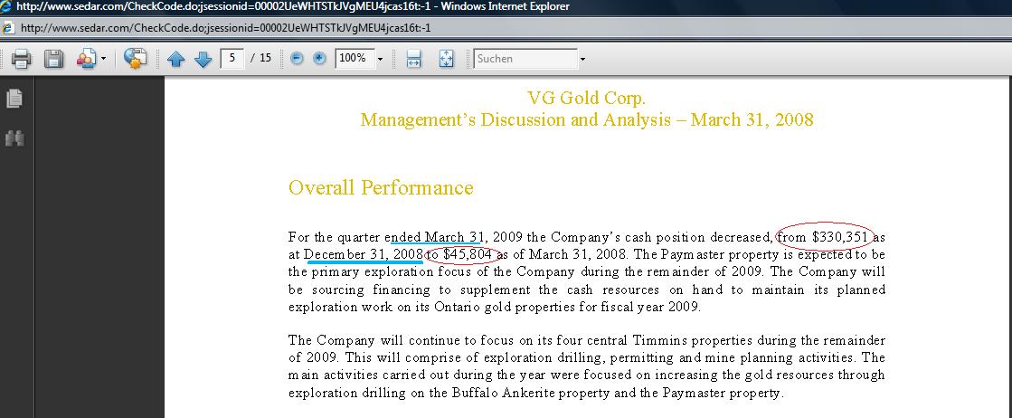 For further information contact Tom Meredith, President of VG Gold, 416 368 0099.
